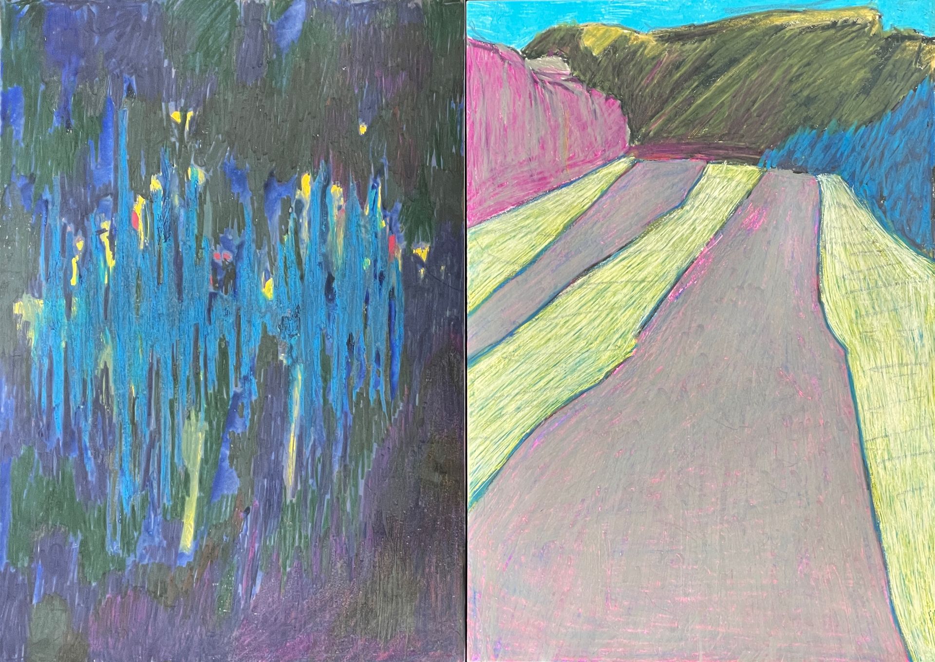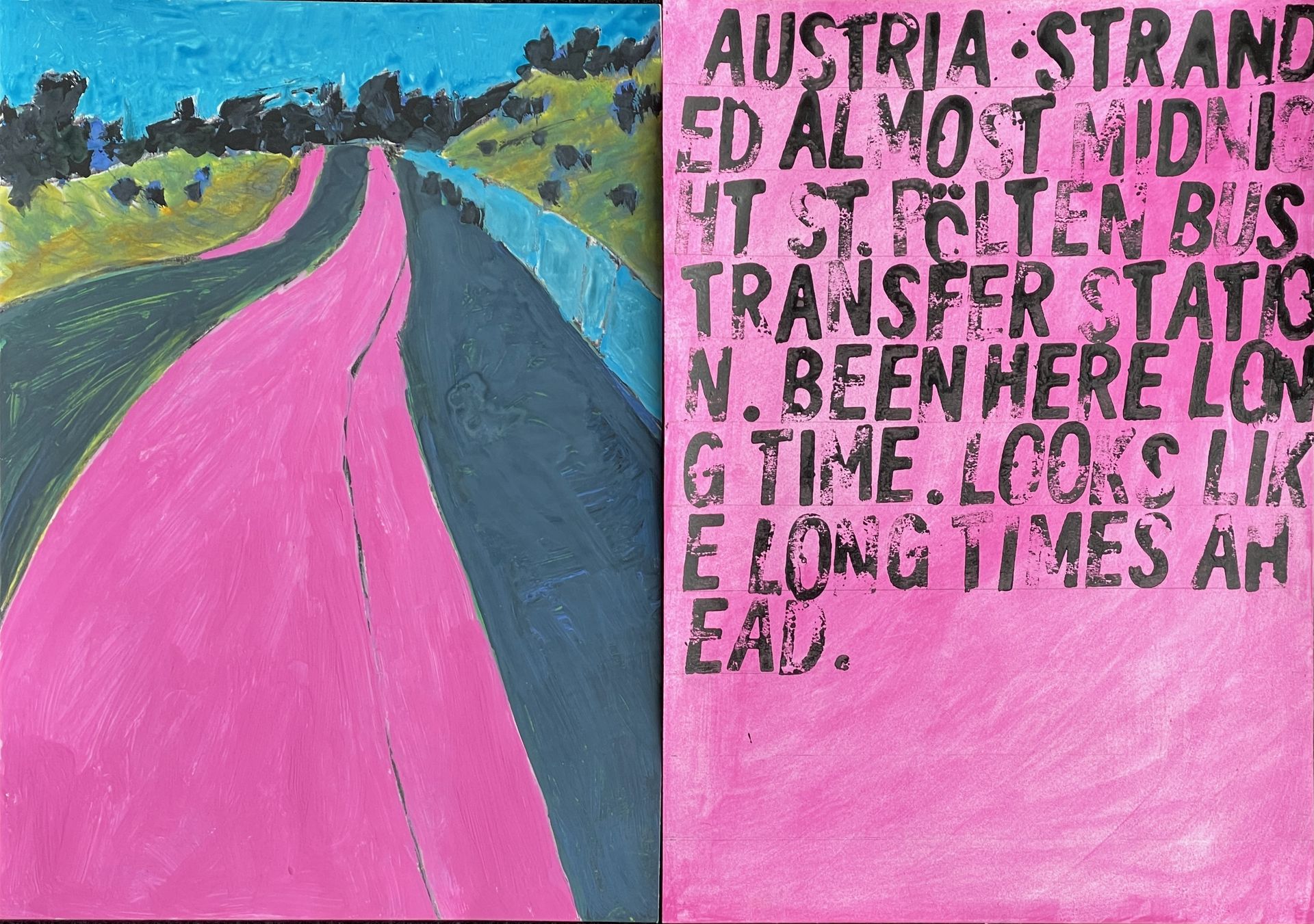 The works on view are recent creations, many the result of a 5-week August/September 2025 residency in in the city of Krems, Austria, situated in the Wachau white wine region. I have created a new group of Lost Highway drawings, in a larger format than previously attempted. They are notations, improvisations, spontaneous impressions, most often done while sitting in the passenger seat of a moving vehicle. This series has it's origins in the endless city-to-city travels that are part of a musician’s life. The activity – sketching from the passenger seat of a moving vehicle, has now become something of a habit. In my Krems studio I began making larger (A3) size images, using my smaller drawings das templates. I was trying to keep the initial spontaneous impressions alive, while ‘growing’ the works to a larger format.