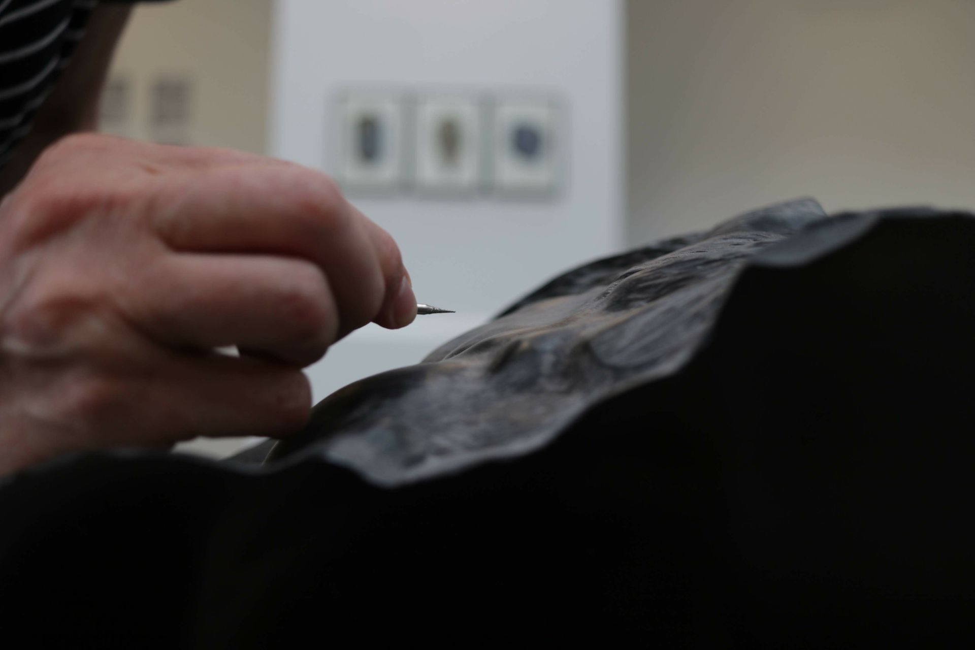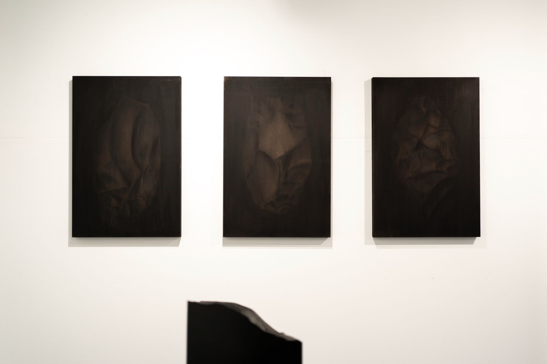 Het zwart in zijn werk is geen leegte, maar een oorsprong: gelaagd en levend, doordrenkt met nuances waarin vergeten vormen opduiken als echo’s in de stilte. Zijn beelden zweven tussen verschijnen en verdwijnen – spookachtig, alsof ze geboren zijn uit dromen of nachtelijke visioenen. In zijn handen wordt houtskool vlees, rook, bot… steen.
